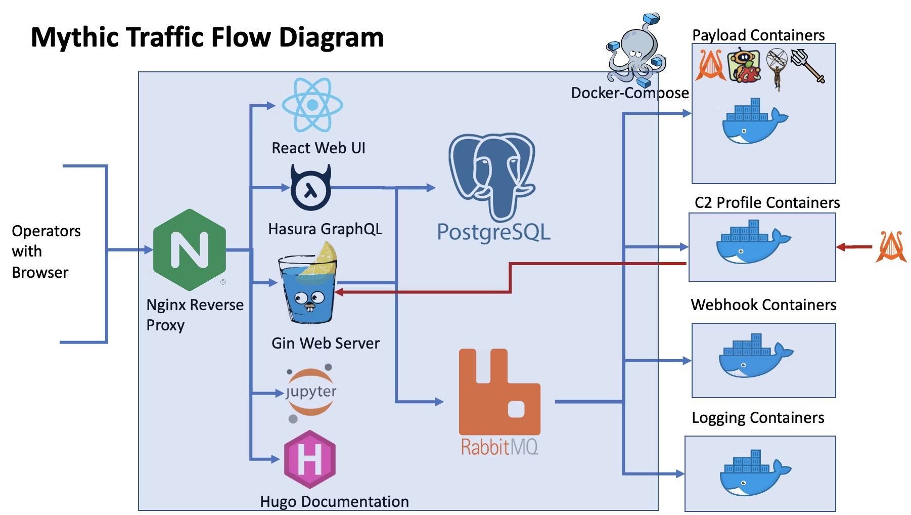 Reactinterface for the graphical dashboardRabbitMQfor internal messagingPostgresas the databaseDocumentationHugo container for mythic documentationServerfor the core Mythic serverJupyterenvironment for development tasksGraphQLAPI serviceNginxacting as the web gateway