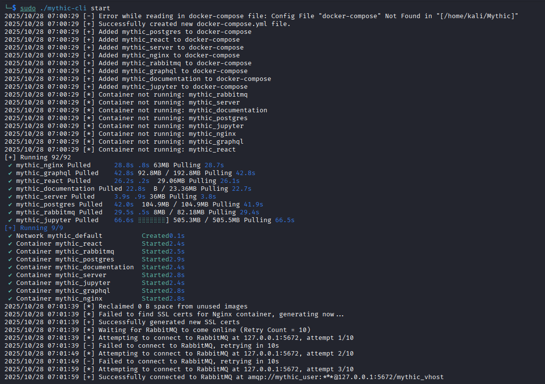 This will pull the required containers, create networks and launch the full Mythic stack. The first run usually takes longer because the images need to be downloaded and initialized.