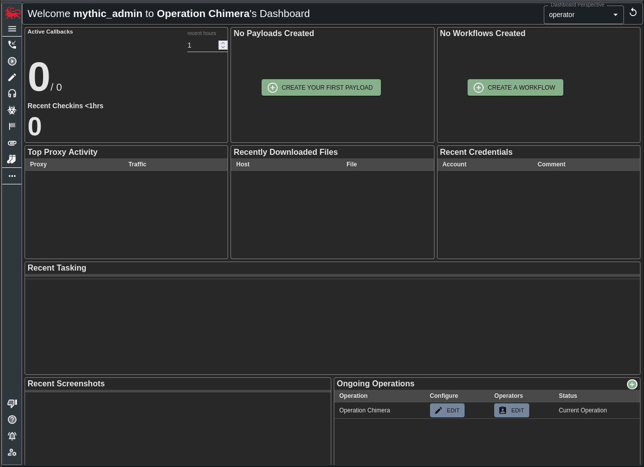 Once logged in, we can see the Dashboard. Here we can see the number of active and recent callbacks, the payloads and workflows created, and other recent activity.