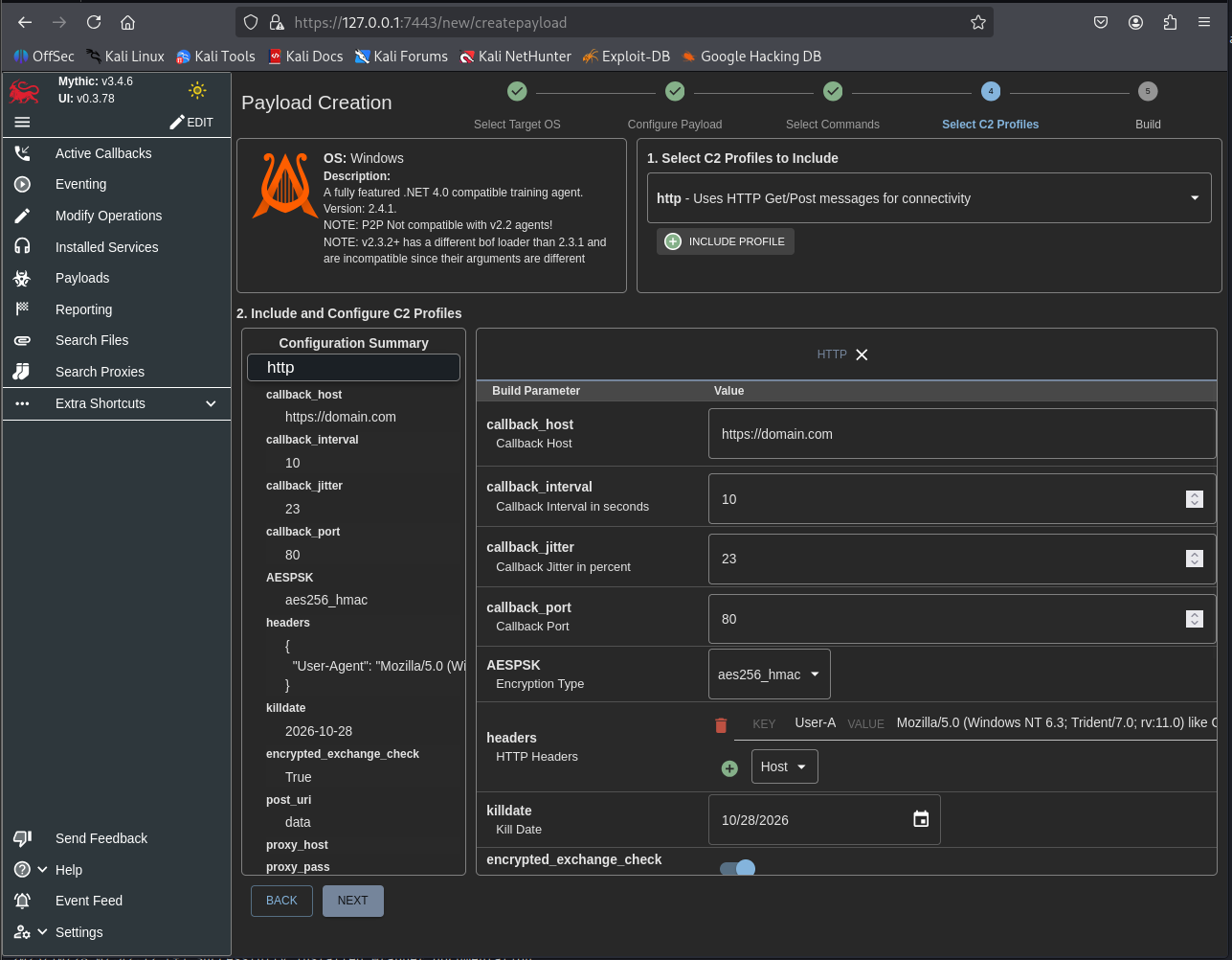 Here we set the callback address. I changed the domain to http://mythic.local so I can resolve it with a custom DNS instead of using the VM IP directly. In this case I’ll leave the rest of the options as default. But here is a small summary.