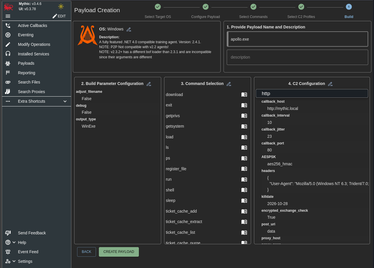 The agents connects to the Mythic C2 using profiles; the easiest and most common is the HTTP profile