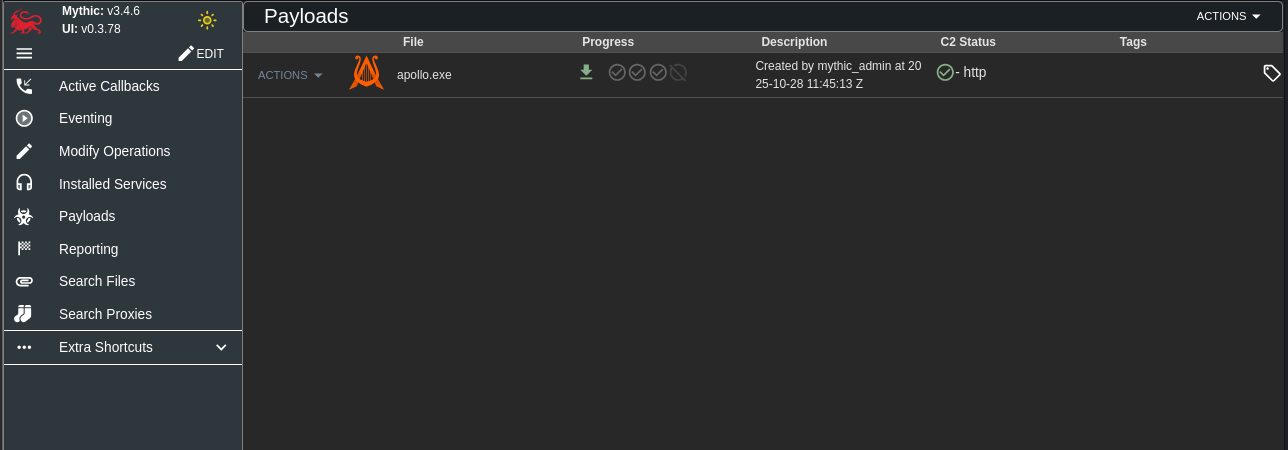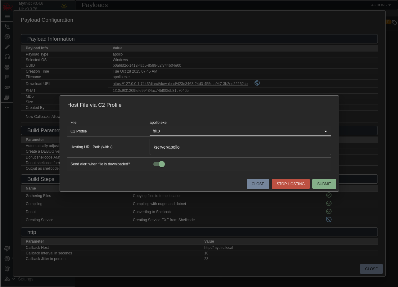 If we don’t want to set a web server or send the payload manually, we can share the binary via the built-in C2 HTTP server. We go to Payload configuration in the ACTIONS menu and click the Download URL World Icon.