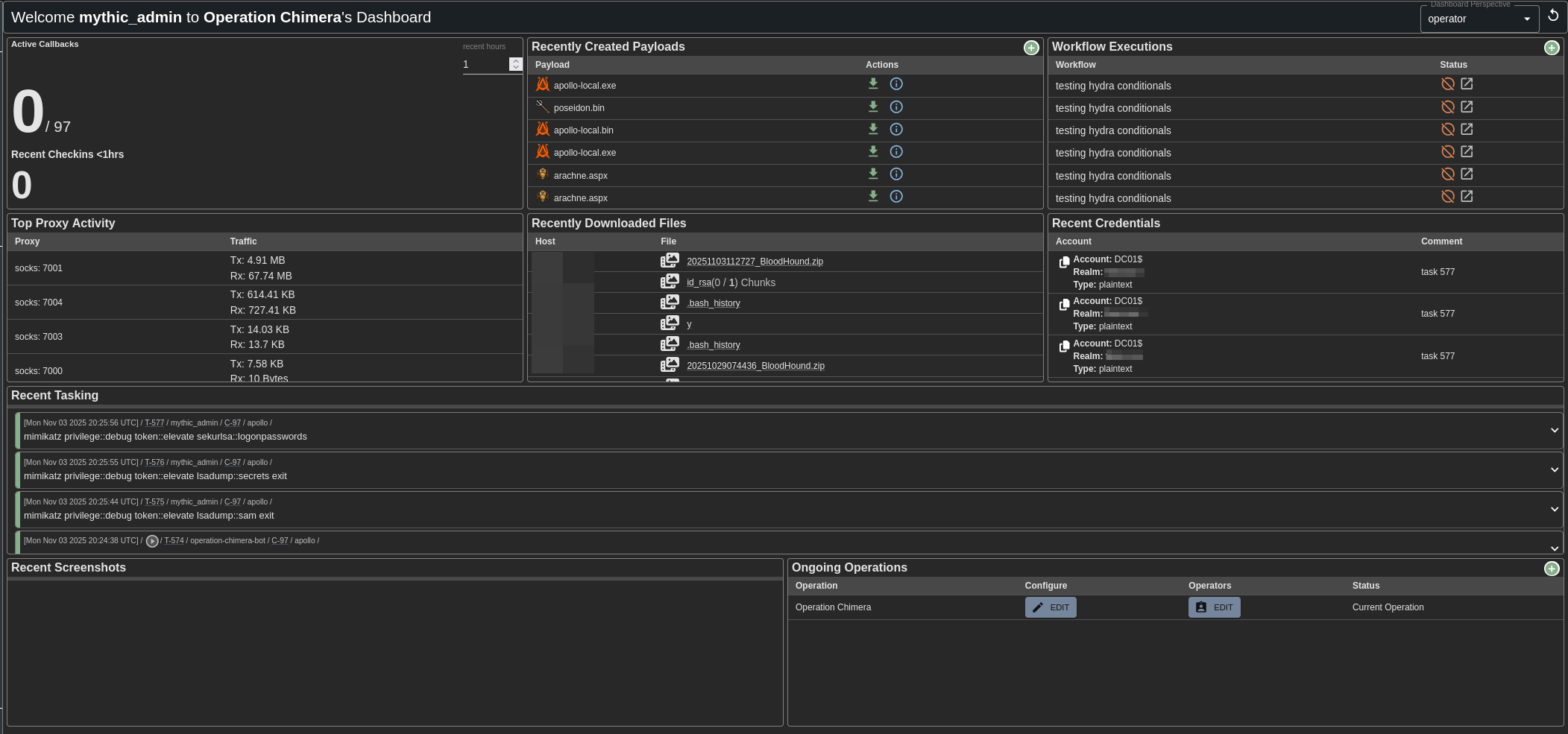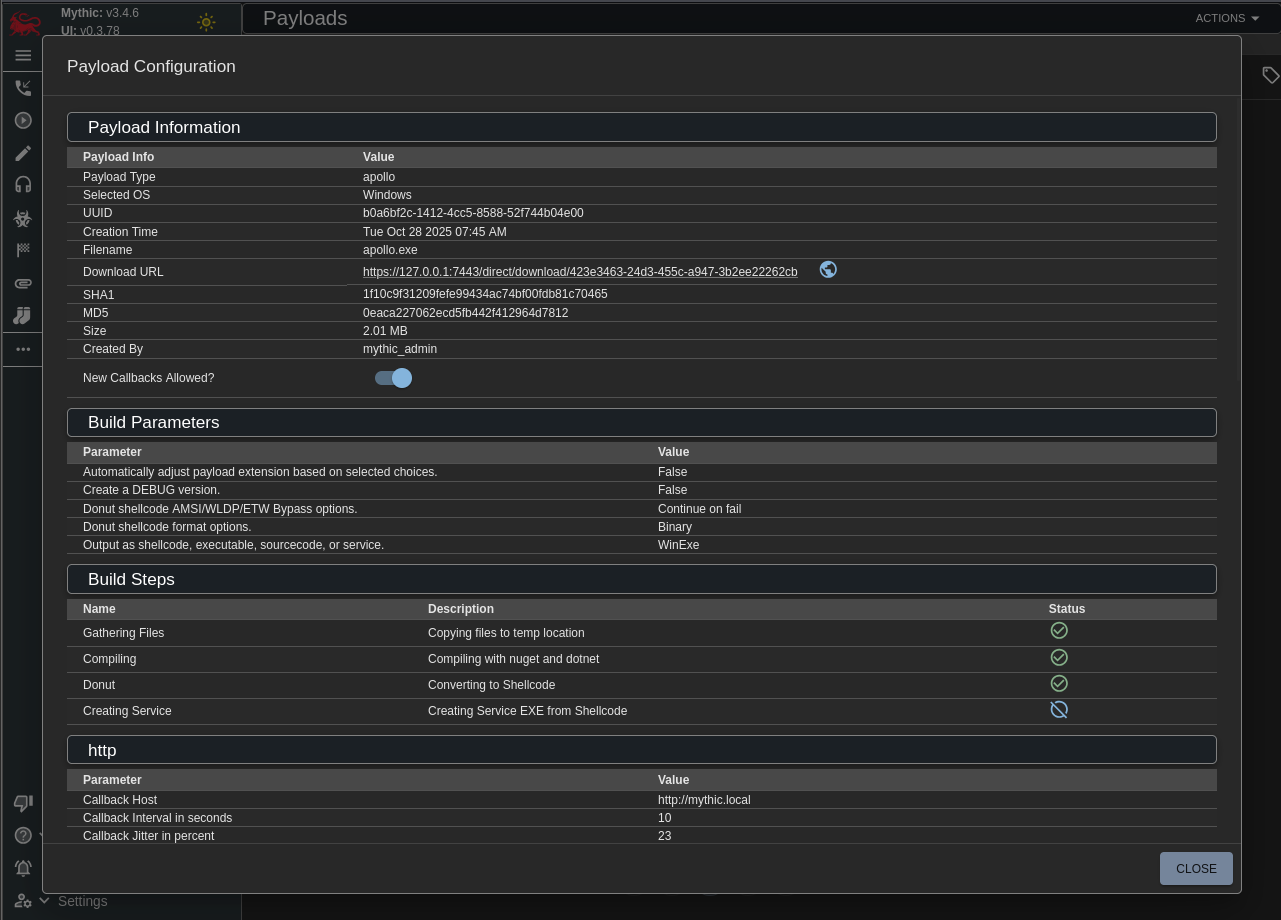The plugin-based architecture may add some initial setup complexity, but the payoff is significant: once configured, Mythic delivers exceptional extensibility, deep integration, and long-term scalability that most alternatives cannot match. While it is a heavier server, it offers a unified GUI capable of managing any existing Mythic payload type, and it also gives you the freedom to build and control your own custom payloads and plugins.