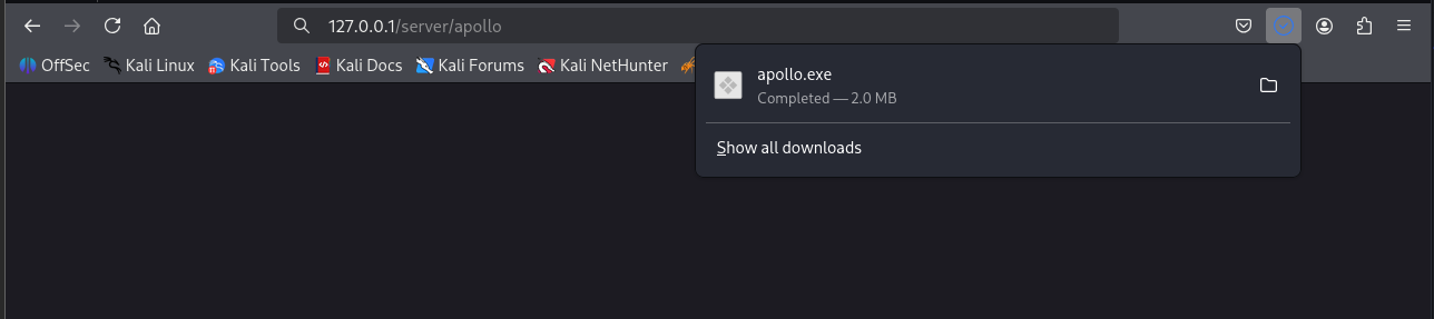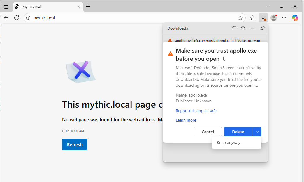 Now you can download the EXE going to that domain and adding the path you set in the Mythic server. The browser tries to block the binary but you can Keep anyway