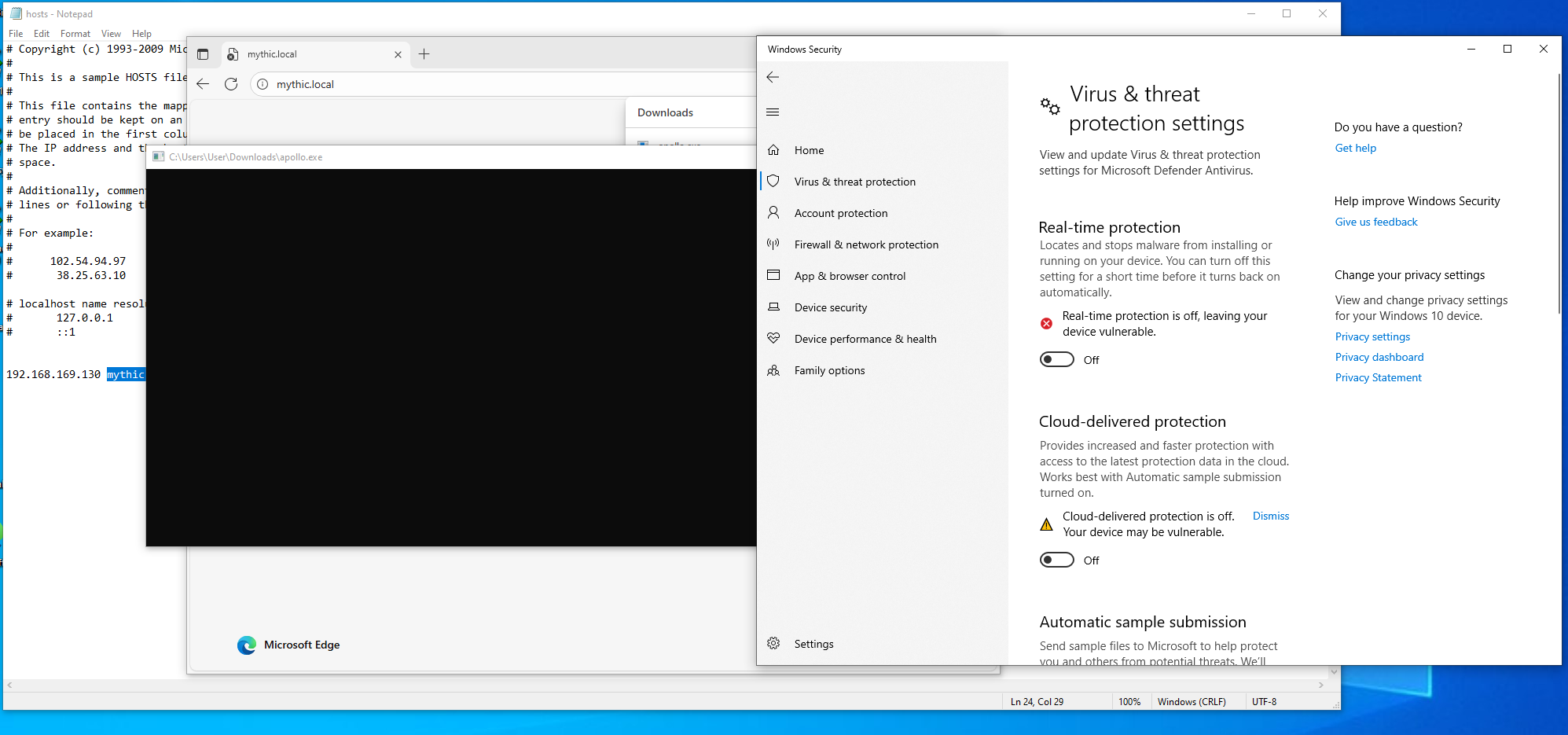I’ll disable Defender during these first tests. In a future post I’ll show how to bypass it without too much effort.