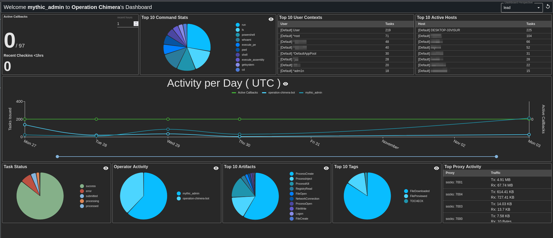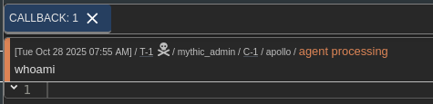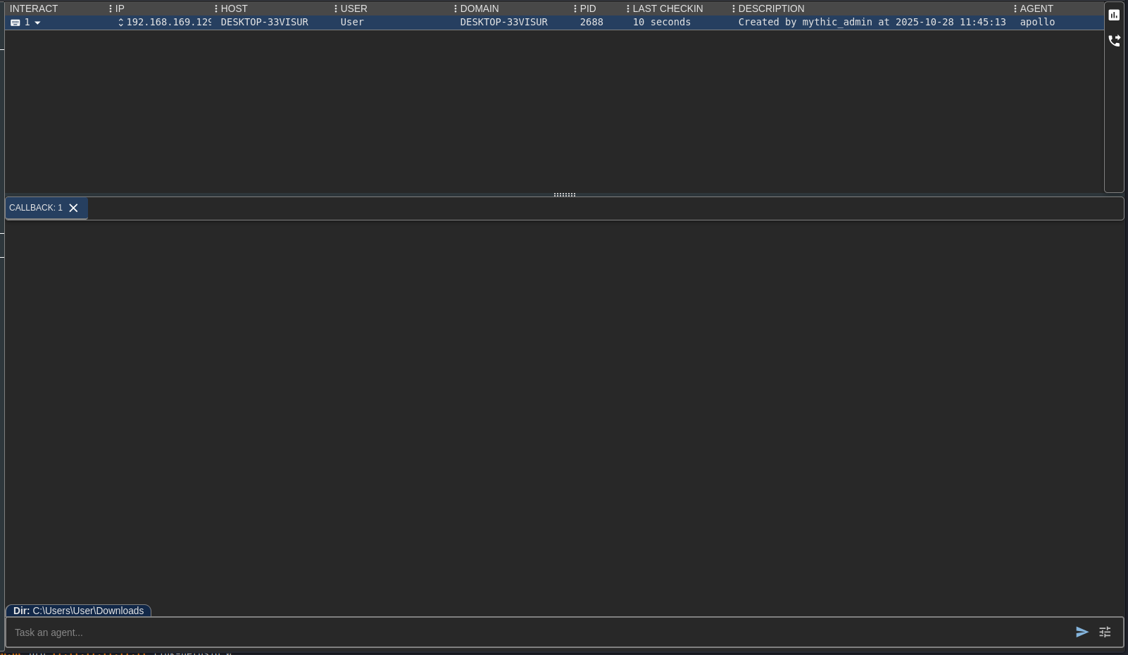 Here we see all agents currently talking to the server. Double click a callback and a new tab opens below for that session. The tab gives a focused view of the agent’s activity and tasking history.