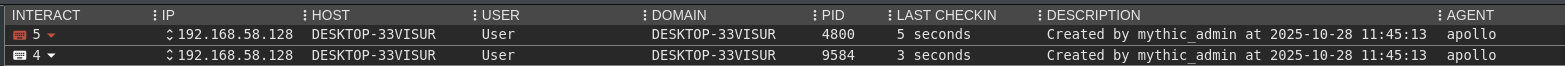 Mythic highlights elevated sessions in the UI so you can spot them quickly. Typical indicators are icons and color accents next to the callback entry to show elevated privileges. In the screenshots you’ll notice an elevated session shows a red keyboard and a red arrow to call out the admin context. That helps you decide which session to interact with when you need higher privileges for certain actions.