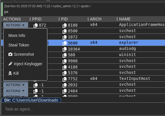 Mythic allows commands with custom GUI in the Tasking section instead of just text, for example, the command ls or ps of Apollo.