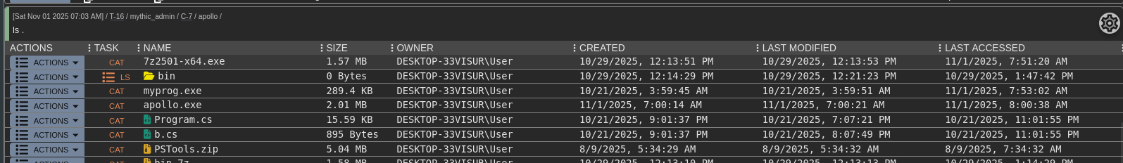 If you run ls in the Apollo agent you get an interactive listing of the files and folders in the current directory. The UI shows the name, size, timestamps, and some basic metadata so you can quickly scan what is there.