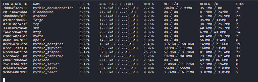 If we run docker compose stats we can see the resource usage of the containers. In the following image we can see the memory usage and CPU of a Mythic environment with multiple agents and different add-ons, with a total of almost 2 GB of RAM.